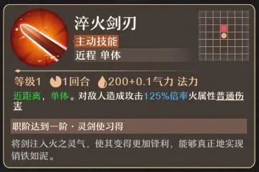 淬火剑刃(主动技能):近距离,单体。对敌人造成攻击125%倍率火属性普通伤害。