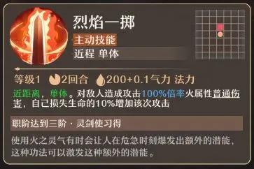 烈焰一掷(主动技能):近距离,单体。对敌人造成攻击100%倍率火属性普通伤害,自己损失生命的10%增加该次攻击。