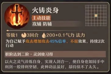 火铸炎身(主动技能):为自己赋予攻击增加攻击45%倍率,不屈效果,持续2次行动。