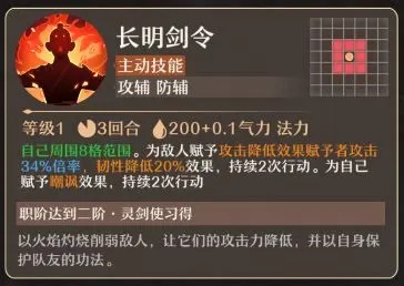 长明剑令(主动技能):自己周围8格范围。为敌人赋予攻击降低效果赋予者攻击34%倍率,韧性降低20%效果,持续2次行动。为自己赋予嘲讽效果,持续2次行动。