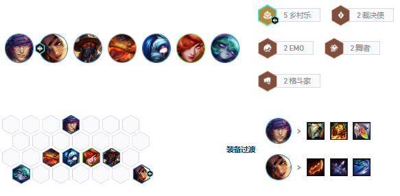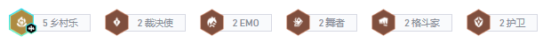 2、羁绊:5乡村乐、2裁决使、2 EMO、2舞者、2格斗家、2护卫