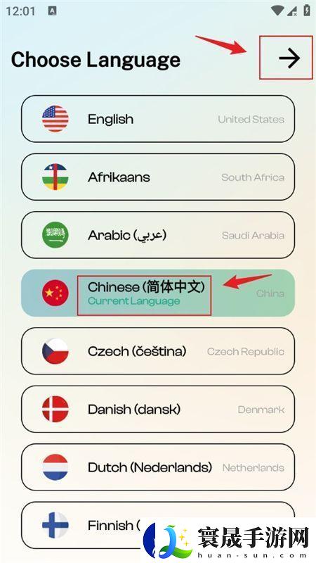 3、进入到语言选择界面,找到Chinese(简体中文),然后点击右上角的箭头保存即可。