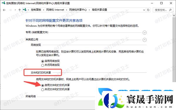 2、在“专用”和“所有网络”选项下,确保“启用文件和打印机共享”处于开启状态。