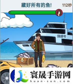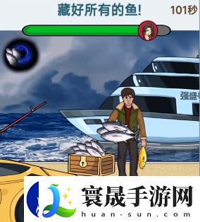 1、点击井盖,会出来一个人,将金色的鱼放进他手里,并用锤子把他打下去。2、将网放在船上,可以把鱼放在网里和甲板上。3、打开跑车的后备箱,将鱼塞在里面。4、点击鱼竿,海里会出来一只鲨鱼我们将一桶鱼放在鲨鱼的嘴里并移动锤子打下去。5、点开天上的两朵云,会出现一个黑洞,我们将鱼放在黑洞里。6、把最后剩下的一些鱼移动到强哥身上,就能顺利通关了。