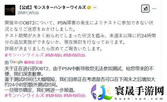 《怪物猎人》X上宣布,《怪物猎人:荒野》第二次BETA公测因为PlayStation Network服务发生故障而导致许多PS5玩家无法参加。由于测试时间大幅缩短,因此目前正在研拟于追加约24小时的测试时间。详情将于确定后另行公告。