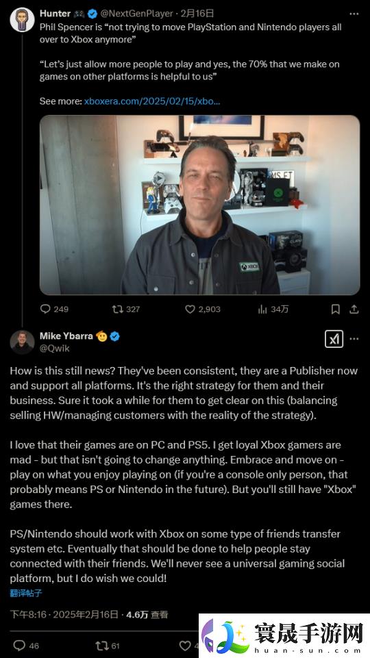 他表示,Xbox 团队自始至终都一直是一家发行商,将支持所有平台。他说道:“我喜欢他们的游戏现在也在 PC 和 PS5 上,我知道忠实的 Xbox 玩家很生气——但这不会改变任何事情。只有接受并别再纠结——现在你可以在自己喜欢的设备上玩(如果你只玩主机,那可能意味着将来会用 PS 或任天堂)。但你依然会有‘Xbox’游戏。”