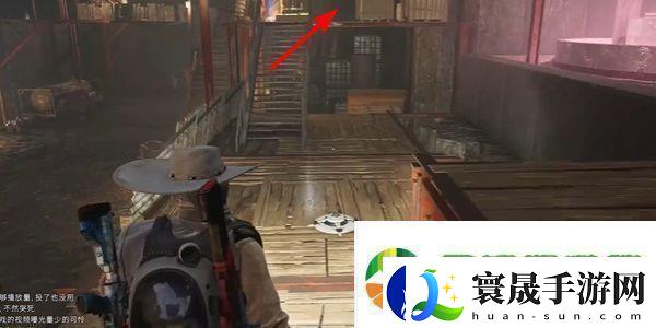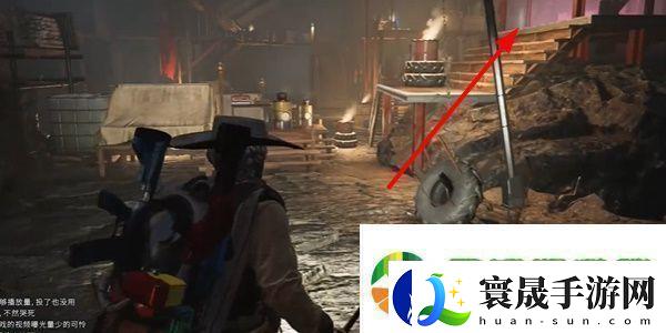 3、沿着楼梯往上走,来到油桶上方位置。