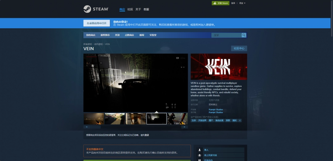 VEIN是一款后启示录生存多人沙盒游戏,而这款游戏的下载网址就是购买平台的购买页面,比如Steam版就是在购买页面购买之后,点击页面中的马上开玩就可以开始下载了。