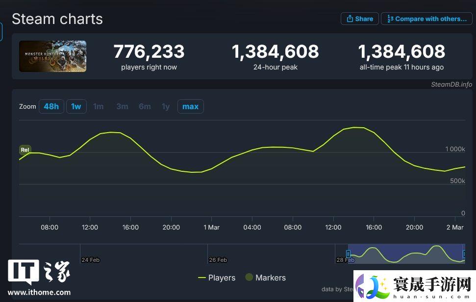 本站 3 月 2 日消息,根据 SteamDB 数据,《怪物猎人:荒野》游戏在 2 月 28 日上线首日,Steam 平台同时在线玩家数峰值达到 1307976 人。本站发稿前查询该页面,过去 24 小时峰值在线玩家数量达到了 138460