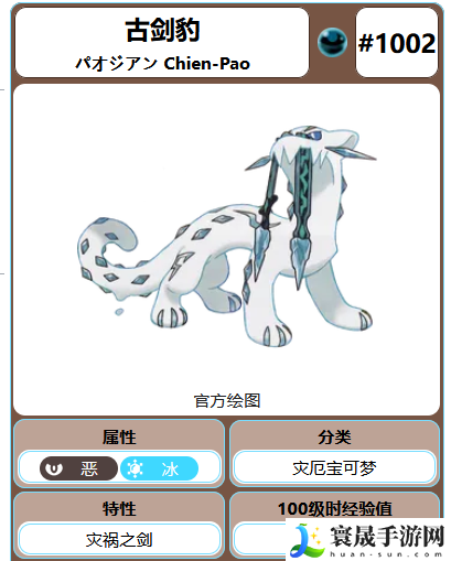 5、古剑豹是一只恶属性和冰属性的神兽宝可梦,分类是灾厄宝可梦,特性是灾祸之剑。