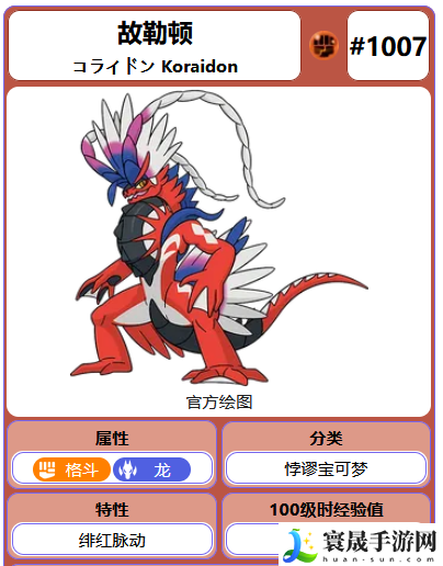 1、故勒顿是一只格斗和龙属性的神兽宝可梦,分类是悖谬宝可梦,特性是绯红脉动。