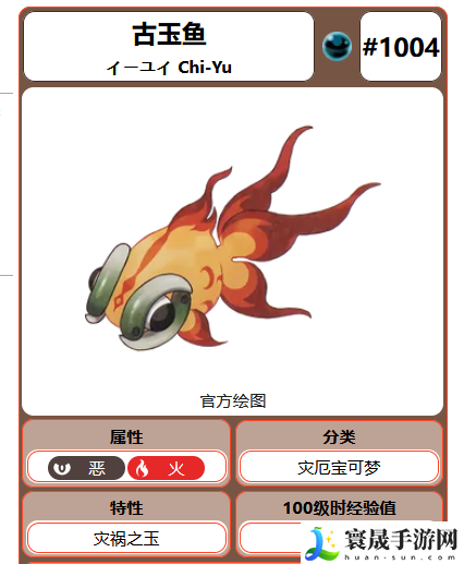 4、古玉鱼是一只恶属性和火属性的神兽宝可梦,分类是灾厄宝可梦,特性是灾祸之玉。