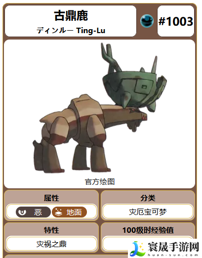 6、古鼎鹿是一只恶属性和地面属性的神兽宝可梦,分类是灾厄宝可梦 ,特性是灾祸之鼎。