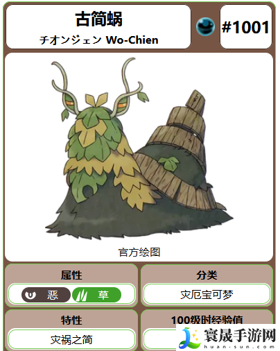 3、古简蜗是一只恶属性和草属性的神兽宝可梦,分类是灾厄宝可梦,特性是灾祸之简。
