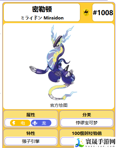 2、密勒顿是一只电属性和龙属性的神兽宝可梦,分类是悖谬宝可梦,特性是强子引擎。