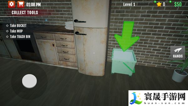 5、玩家需先把桶子装满水,然后用拖把沾水清理血迹;
