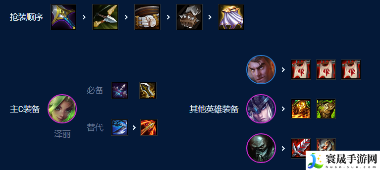 优先做出轻语+双基克打过渡。后面同时补出前排的肉装和泽丽的输出装。多余的装备再养螃蟹。