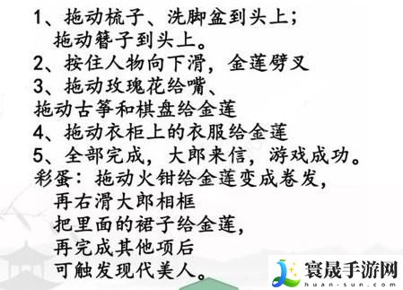彩蛋:拖动火钳给金莲变成卷发,再右滑大郎相框,把里面的裙子给金莲,再完成其他项后,可触发现代美人。