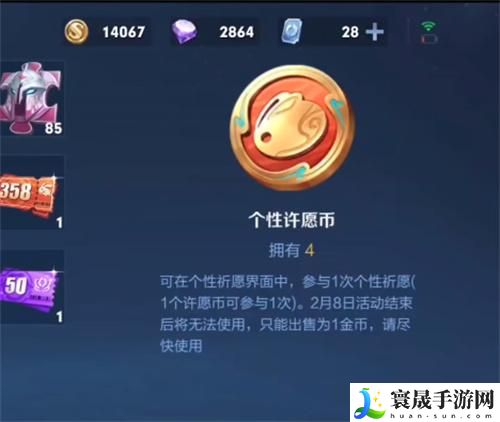 作用:可以在【特定许愿活动】中,使用个性许愿币参与活动祈愿,1枚个性许愿币可以参与一次。