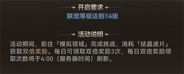 1、前往模拟领域完成挑战,消耗结晶波片获得双倍奖励;