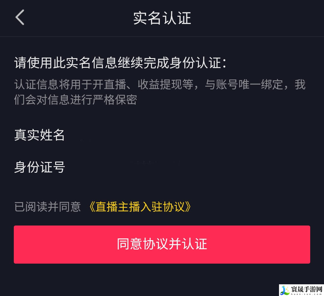 3、在开启直播前需要进行实名认证,输入自己真实姓名和身份证,点击同意协议并认证。