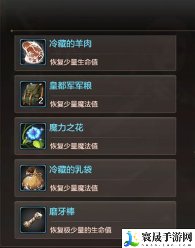 2、包括魔力之花(魔法值恢复115)、冷藏的羊肉(生命值恢复1700)、冷藏的乳袋(魔法值恢复1200)、皇都军军粮(魔法值恢复115)。