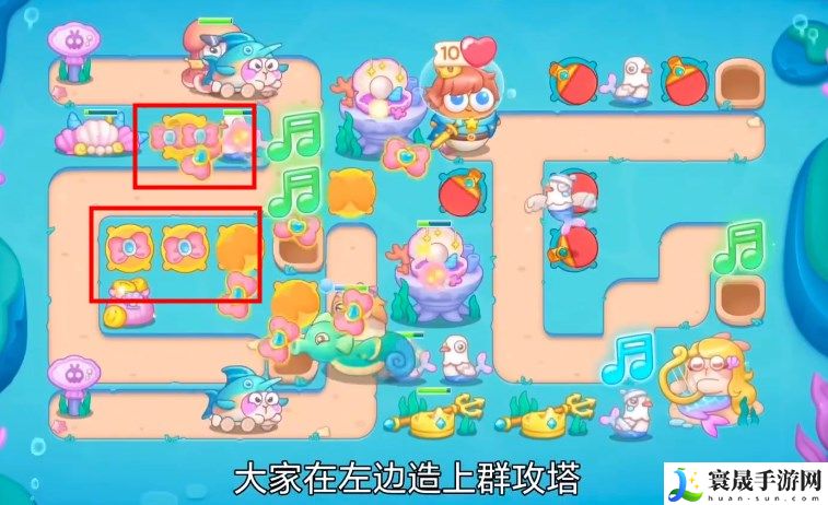 3、左边建立蝴蝶结炮塔清理路障的效果会更好,右边继续建立球拍。