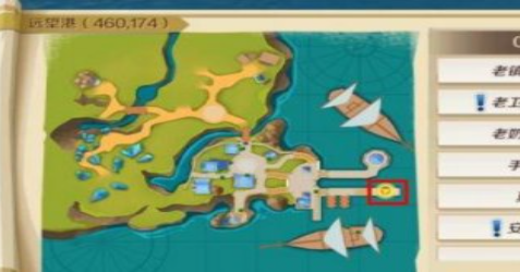 4、打开世界地图,找到遥望港,在最右下角位置港口位置,找到一个钓鱼竿,在这里就可以直接钓鱼了。