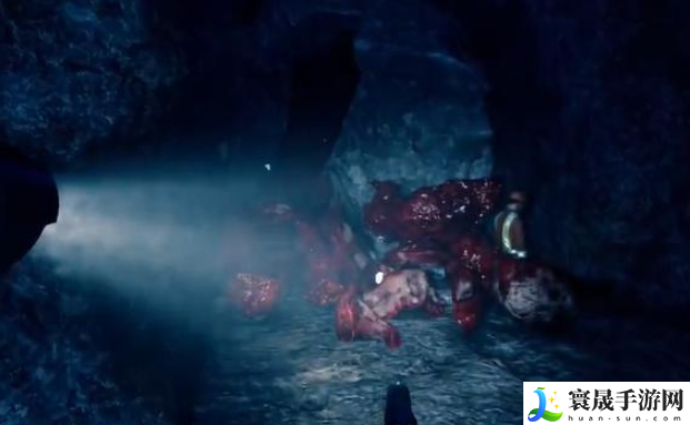 3,如图达到这个位置后,会在尸体的旁边看到炸弹,把炸弹捡起来,后面的有一个大的怪物将路口堵住会用到,把炸弹丢到怪物身上将怪物炸成碎块就可以往前继续走了。