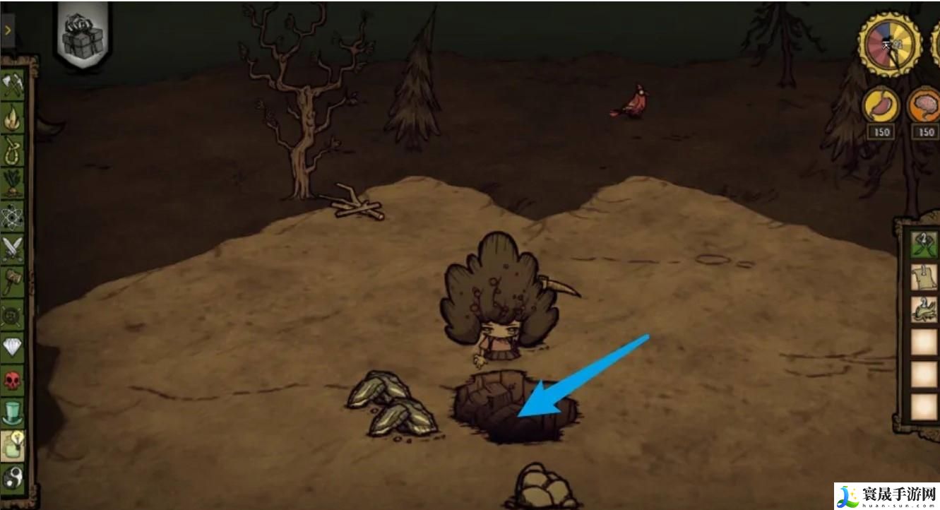 1、玩家来到兔子洞这里,在洞口放置炸药,将挡在洞口的石头炸开。