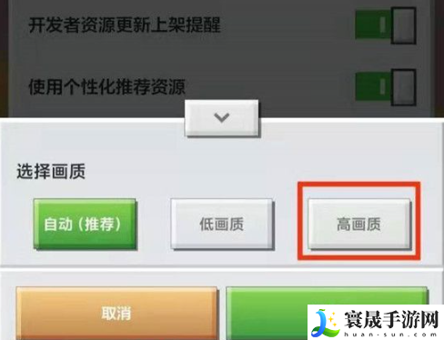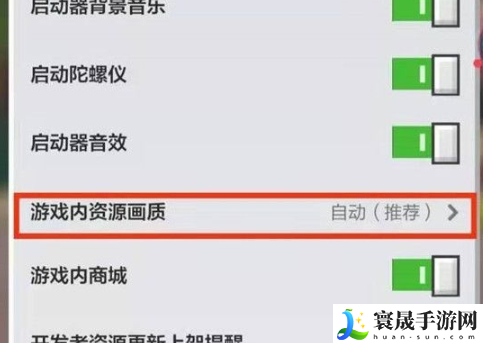 3、找到“游戏内资源画质”,点击进入,能看到三个画质选择,可根据自己喜好,或硬件配置进行选择。