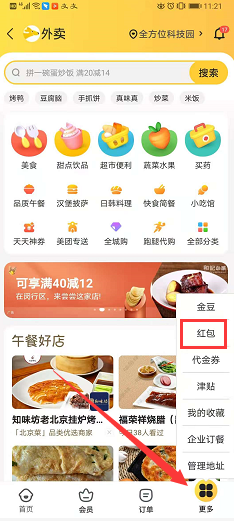 1、打开美团,进入主页面后,点击右下角更多,在上方弹出的页面中选择红包,如下图所示。