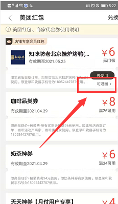 2、进入美团红包页面,能看到自己拥有的各种红包,选择你想退回的店铺红包,点击“可退回”。如图所示。