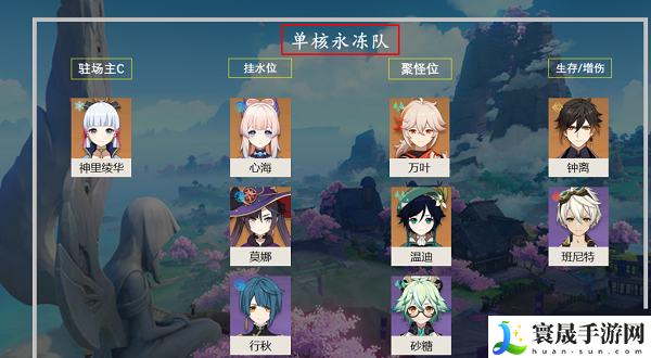 3、原神神里绫华阵容搭配三:神里绫华+申鹤+风系(万叶/温迪/砂糖)+生存(钟离/班尼特/迪奥娜)。