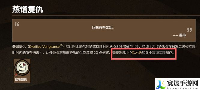 4、蒸馏复仇:1个活木头和3个哀悼荣耀制作而成。