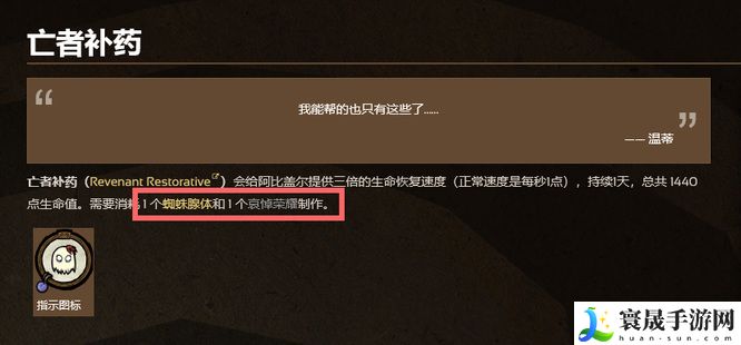 1、亡者补药:1个蜘蛛腺体和1个哀悼荣耀制作而成。