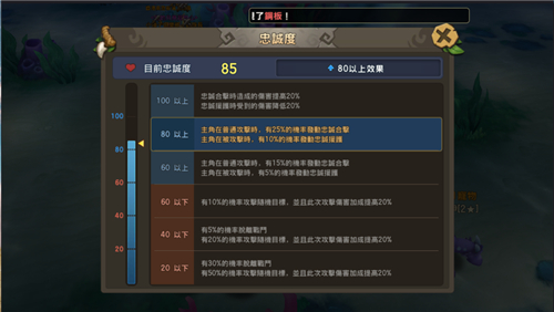 1、宠物忠诚度在60级以上算是合格,也就是下图显示的蓝**域,合格的宠物会听从玩家的指令,在战斗中和自己一起战斗,并保护角色不受伤害。