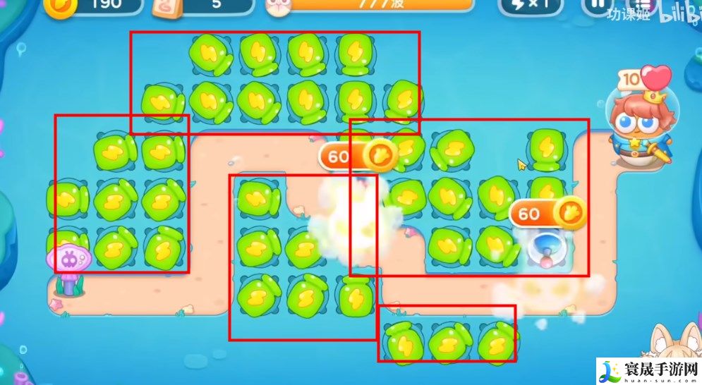 1、开局在右下角建立两个瓶子炮塔和一个闪电炮塔用来攻击boss,还可以乘着间歇攻击周边的道具。