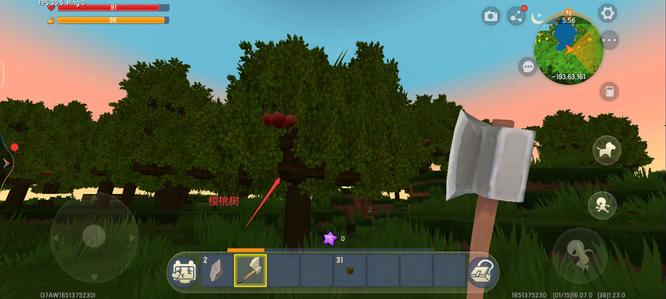 2、接着来到树下,使用斧头对准樱桃树的细树枝,点击砍伐。