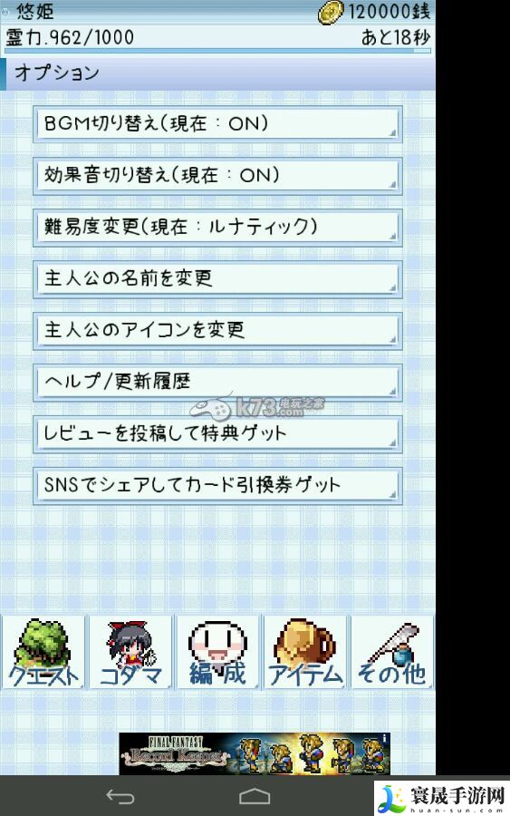 由上往下第一项是开关bgm 第二个是效果音开关 第三项是决定你自己想要的主人公名字 第四个是主人公的图像 第五个是说明书跟更新履历