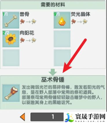 巫术骨锤制作方法:在工具箱位置,花费1个兽骨、2个向阳花和1个荧光晶体,可制作出巫术骨锤