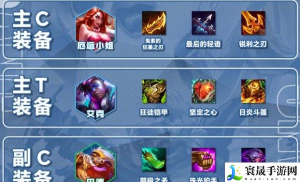 女枪主c带羊刀、轻语,最后一件可以选物理输出装备。如果是天选且有超粉的话会提供一件死亡之刃。