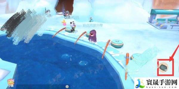 2、下图的鱼池就是雪山鱼池,靠近点击右边撒鱼钩,垂钓。