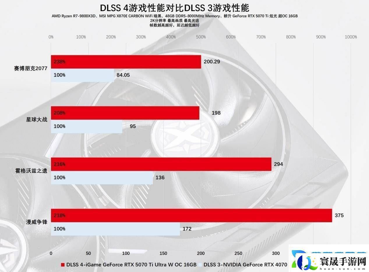 X3D处理器、微星MSI MPG X870E CARBON Wi-Fi主板以及芝奇Trident Z5 RGB内存等高端硬件,以确保测试结果的准确性。测试结果显示,耕升RTX 5070 Ti 炫光 超OC在2K分辨率下,相较于RTX 4070 Ti,性能提升显著,多数游戏平均帧率超过100FPS,部分游戏甚至达到300 FPS以上。