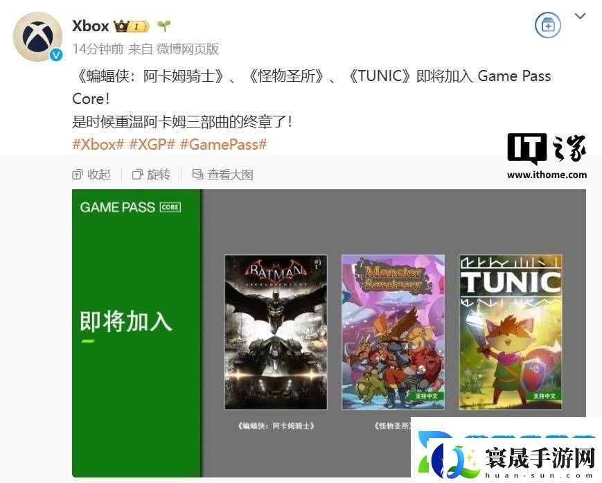 微软Xbox官方近日在微博上公布了一系列令人振奋的游戏加入计划,为玩家们带来了更多精彩选择。其中,蝙蝠侠:阿卡姆骑士、怪物圣所以及TUNIC这三款备受期待的游戏,即将登陆Game Pass Core平台。