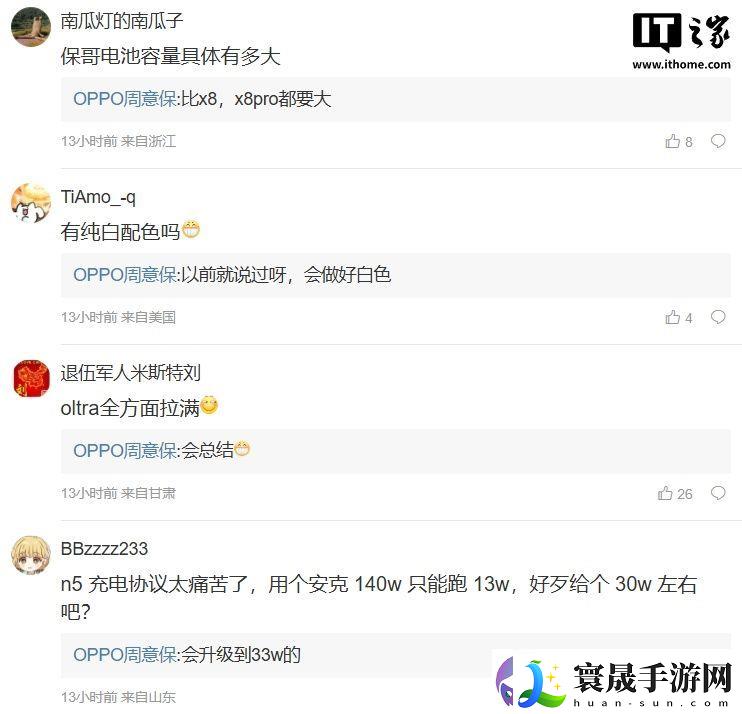 另外,有网友询问新机是否会有白色,周意保称“以前就说过呀,会做好白色”;有网友表示 Find N5 折叠屏手机使用安克 140W充电器只能跑 13W,周意保回复“会升级到 33W 的”。