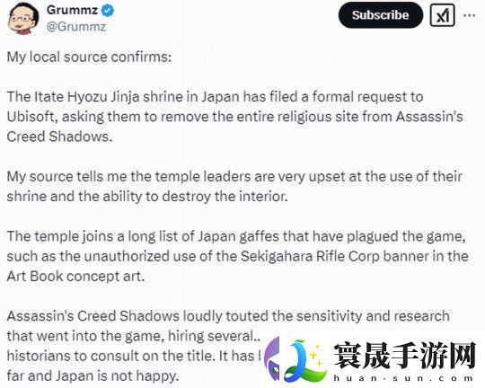 Grummz表示:“据知情人士透露,日本神社负责人对游戏擅自使用其宗教建筑、并允许玩家破坏内部场景的行为非常不满。此举使神社成为继‘关原铁炮队旗帜遭艺术设定集盗用事件’后,《刺客信条:影》涉及日本文化争议的最新案例。”