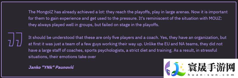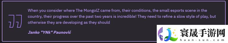 “当你考虑到The MongolZ来自哪里,他们所处的环境和国内小规模的电子竞技圈,他们过去两年的进步是不可思议的!他们需要完善一种较为缓慢的比赛风格,但除此之外,他们的成长是符合预期的。”