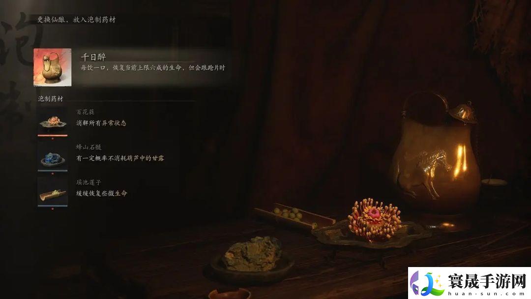 选择千日醉,效果是可以恢复6成生命值。这个效果前期并不明显,但当到了后期血量提升上来后效果就很明显,如果再配合一定药材,一口葫芦下去能恢复9成血量,这个恢复量就大大降低了葫芦的使用次数,增加不少容错率。