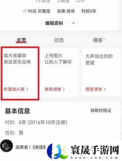 在个人信息页面,找到并点击“唱片架”或类似的选项。